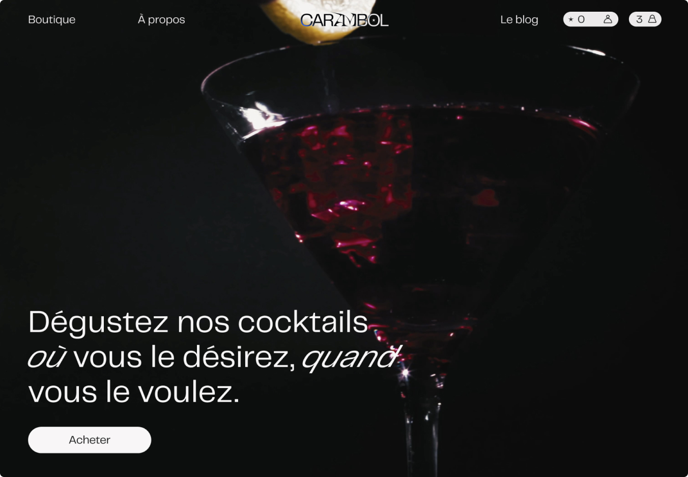 Carambol est un projet de cocktails premium à consommer instantanément, la marque a besoin d’un branding original mettant en avant chaque cocktail ainsi qu’un site web e-boutique.